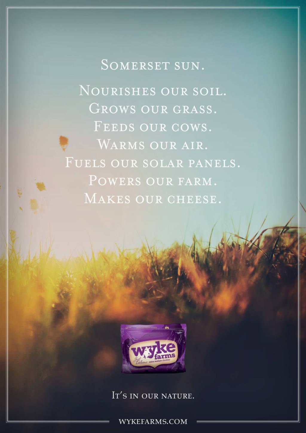 When Wyke Farms became a 100% green company, my art director and I created a press campaign to separate them from the heritage space that most cheese brands occupy. We developed a new tone of voice and art direction, all tied up with the endline: ‘It’s in our nature’.